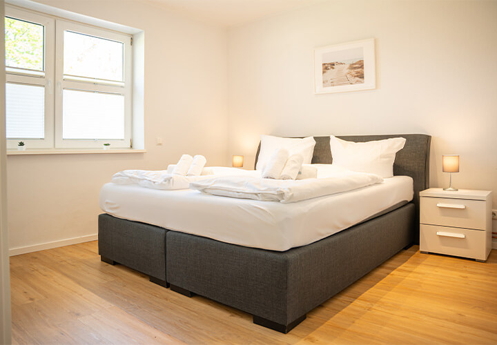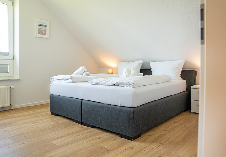 Die großen Boxspringdoppelbetten (1,80 m x 2,00 m, 1,60 x 2,00 m) versprechen Schlafvergnügen der Extraklasse. Ein Bad mit Dusche, Waschbecken und WC steht für entspannte Momente zur Verfügung. Gönnen Sie sich eine Auszeit auf dem gemütlichen Sofa oder Sessel und genießen Sie gemeinsame Stunden vor dem großen Flat-TV oder bei einem köstlichen Essen am Esstisch für bis zu 4 Personen.