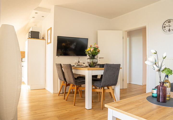 Entspannen Sie sich auf dem gemütlichen Sofa oder Sessel und genießen Sie gemeinsame Stunden vor dem großen Flat-TV. Auch der Esstisch bietet Platz für bis zu 4 Personen und lädt zu köstlichen Mahlzeiten ein.